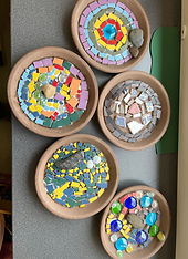 Ich habe Schnitttechniken erklärt und Werkzeuge für das Zerkleinern der keramischen Fliesen zur Verfügung gestellt. Vierecke, Dreiecke und Rundungen wurden mit großem Eifer geschnitten und in Vogeltränken selbständig geklebt und verfugt.